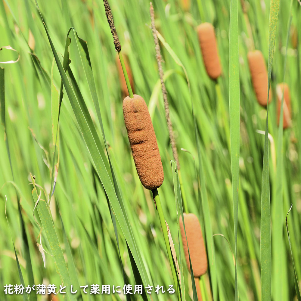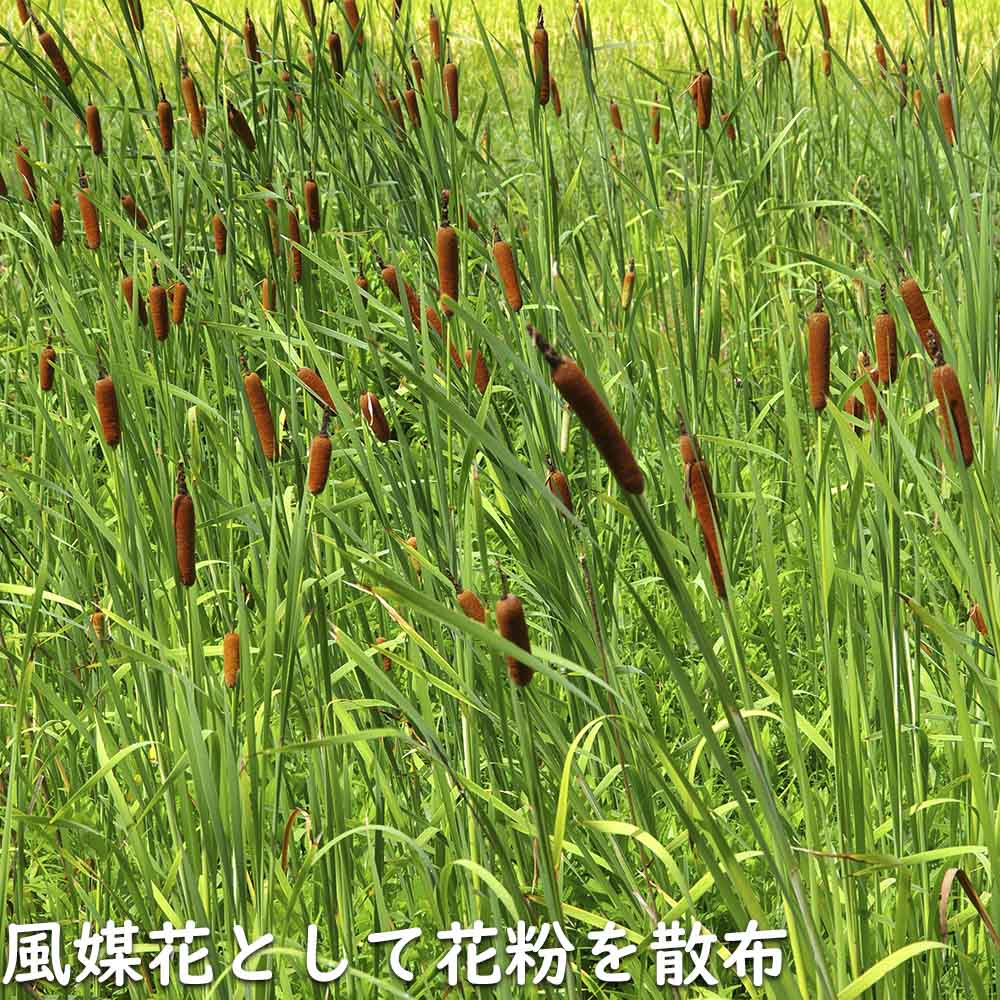 ガマは池や沼に生える多年草です。水中の泥に地中茎を伸ばし成長します。ガマの穂と呼ばれる円柱型の穂をつけます。冬季は根茎のみになります。花粉は蒲黄と呼ばれる生薬で傷薬や利尿・通経作用があります。