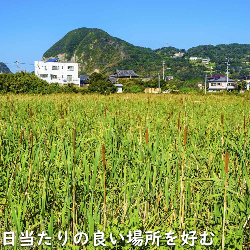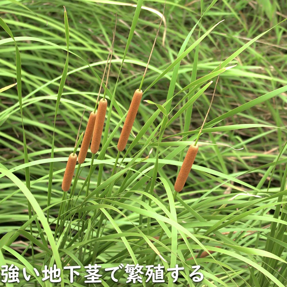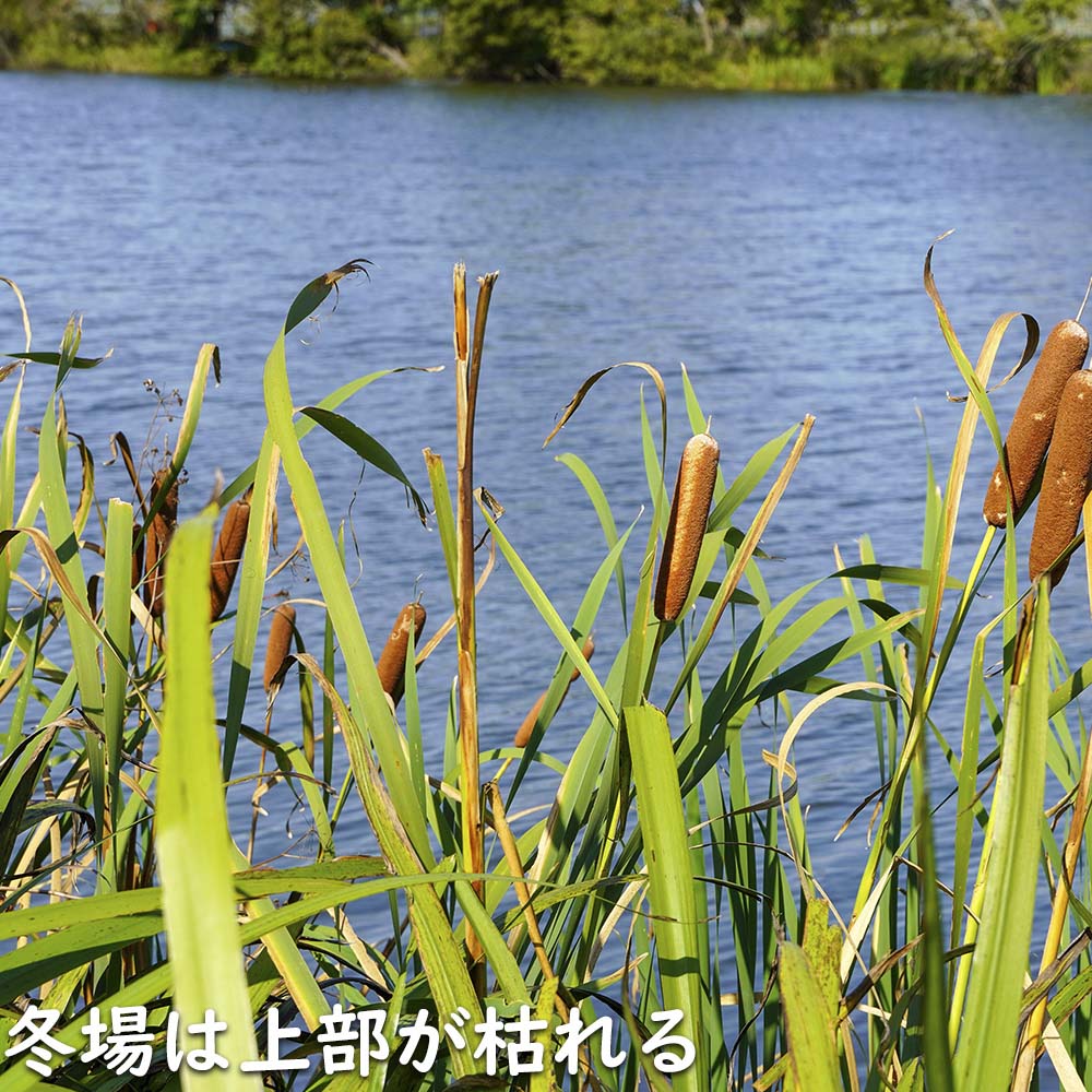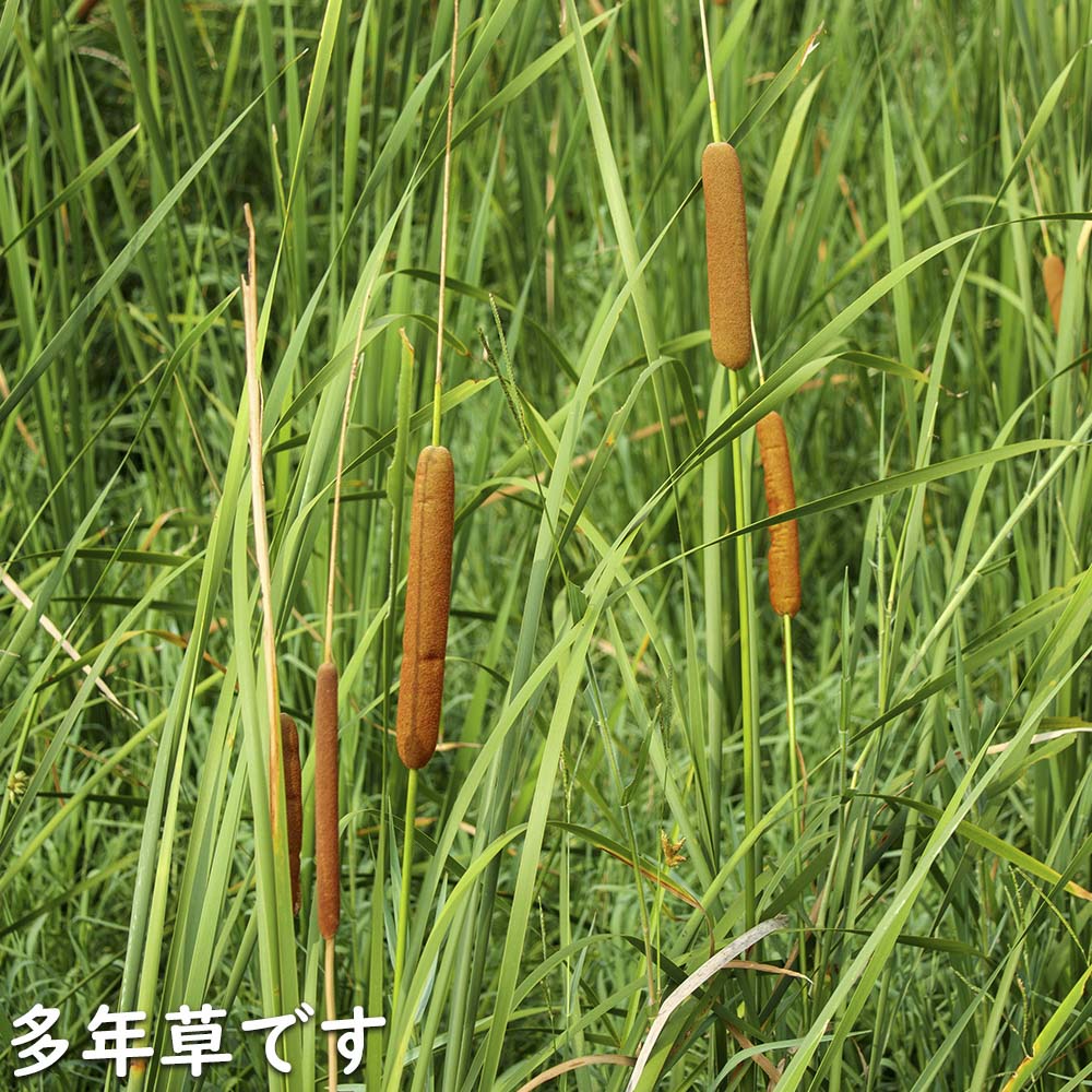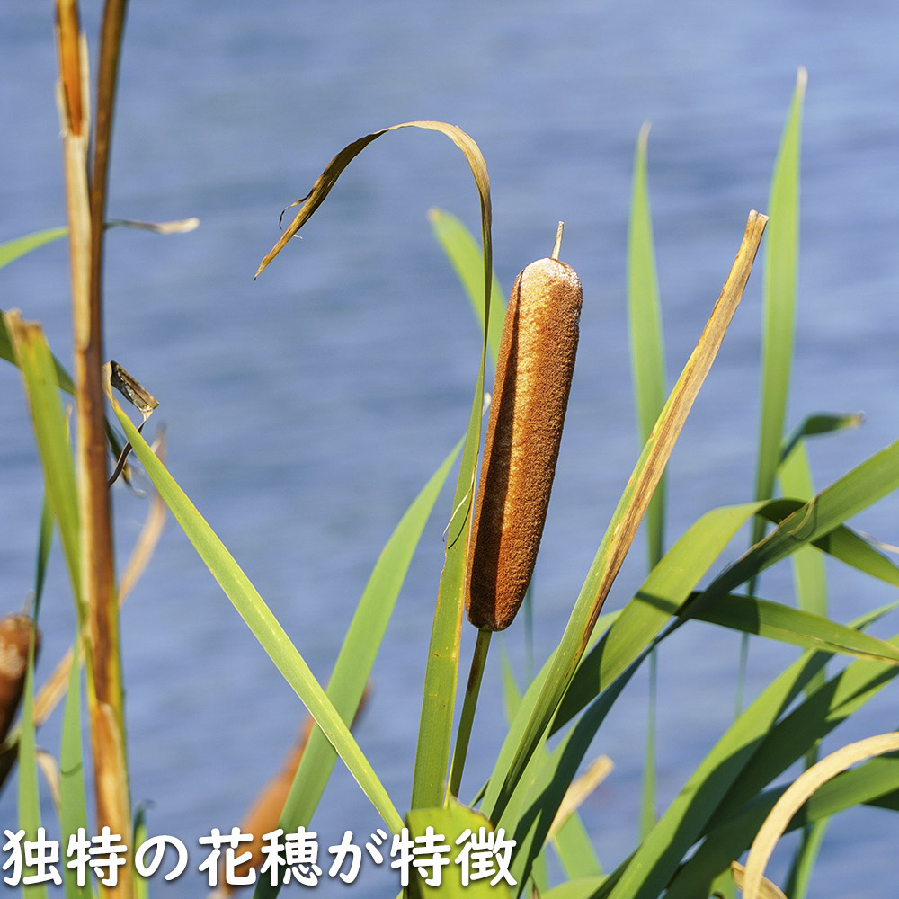 ガマは円形型の花穂が有名な品種です。水生植物ですので水中で管理します。