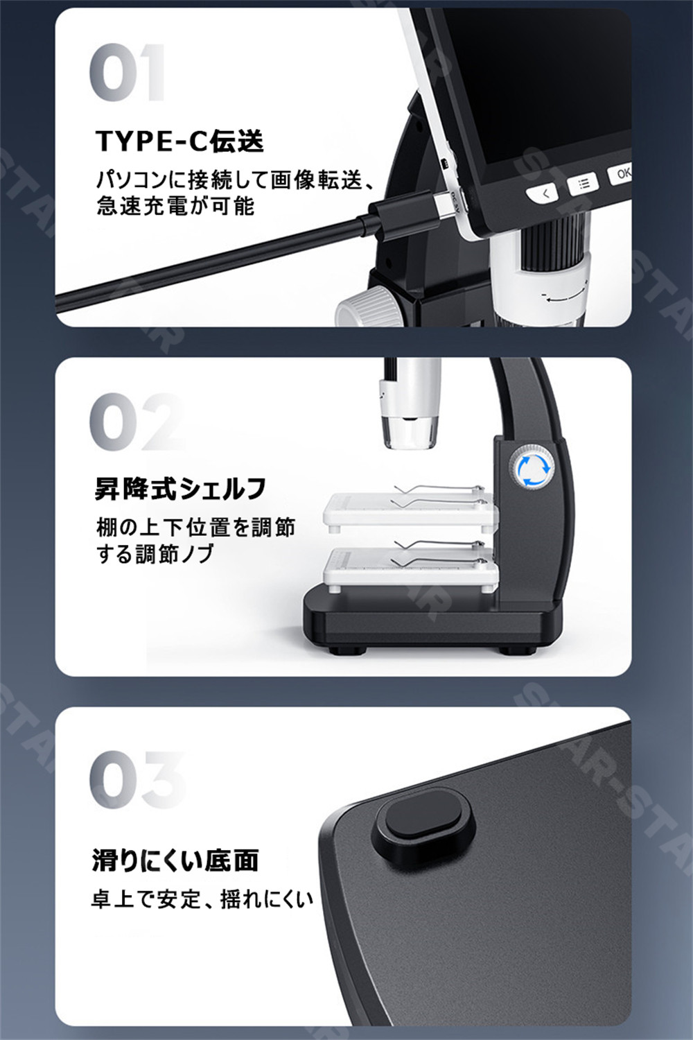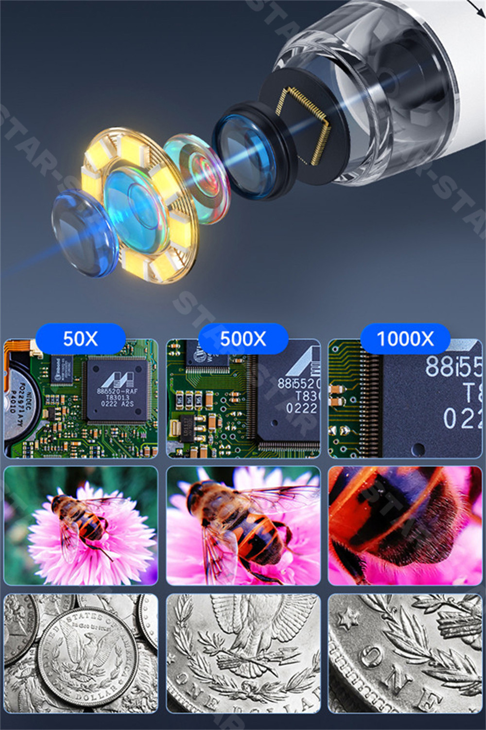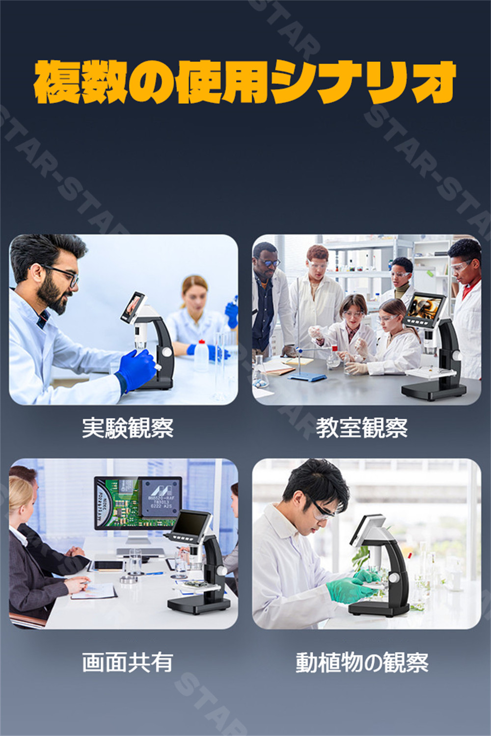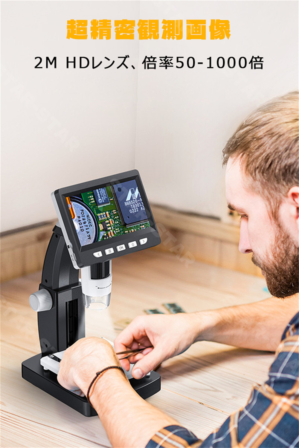 【高倍率】1000倍まで拡大できて、肉眼が見えない微小物、毛穴・皮膚の監視・虫歯の確認、標本、昆虫や動物・植物の表面の研究、電子回路、機械などのクローズアップ、基板のチェックに対応できます。