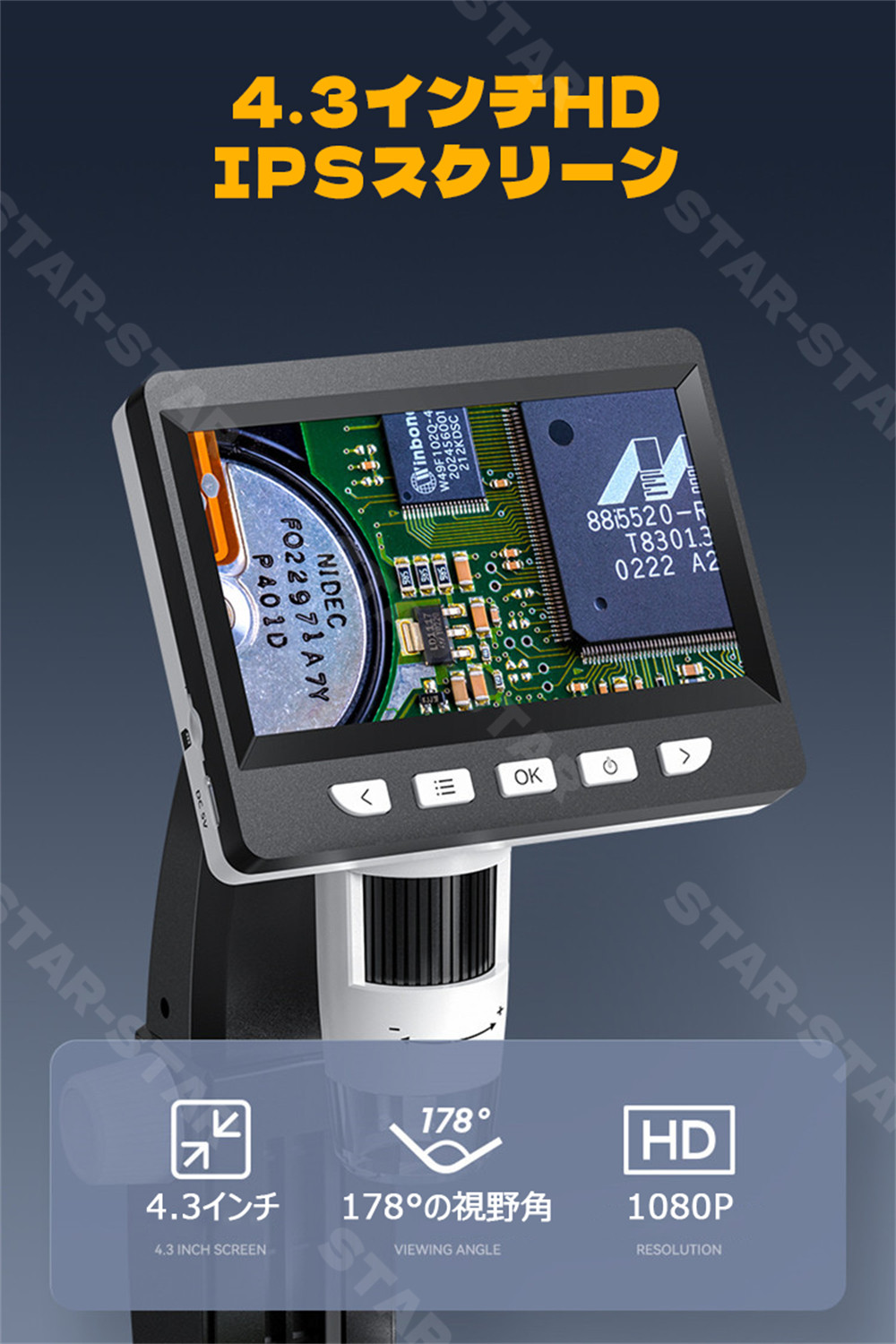 HDMIの高画質出力が可能なデジタル顕微鏡。最大1000倍の光学ズームに対応し、フルHDでの動画撮影も可能。4.3インチのLCDモニタと8つのLEDを搭載した、見やすく観察できるマイクロスコープ。