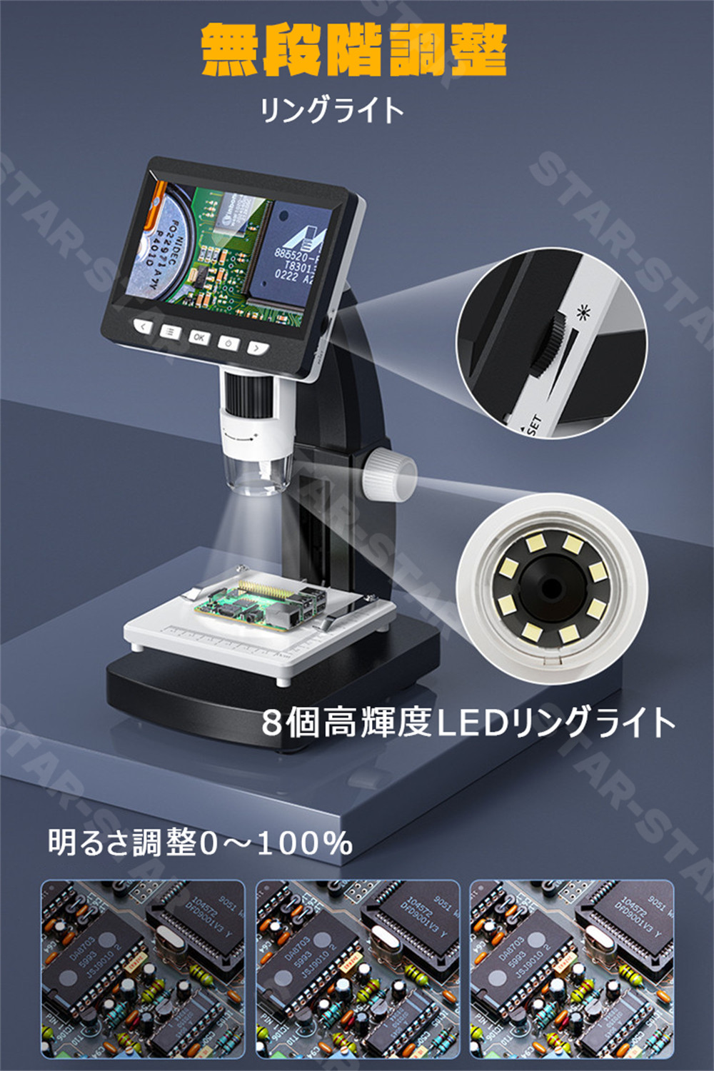 【調節可能なLEDライト付き】明るさ調節可能なLEDライト内蔵、モノ観察にはひかりがとても影響されます。