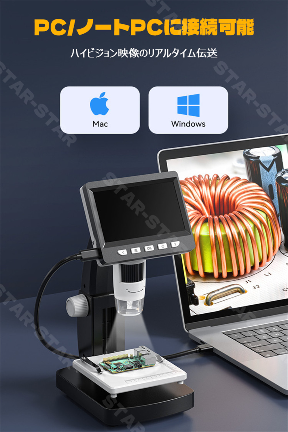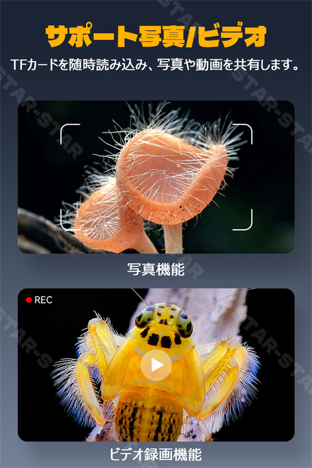 【画像と動画の保存と出力】撮った写真や動画をTFカード(別売り)で保存できます。動画が直接マイクロスコープでリプレイできます。