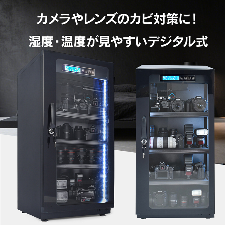 防湿庫 カメラ 保管 防湿 庫 ドライボックス カメラ保管庫 レンズ おすすめ 85L 一眼レフ 静音 省エネ 湿度設定 デジタル湿度計 扉 ガラス 消費電力 カビ 防止