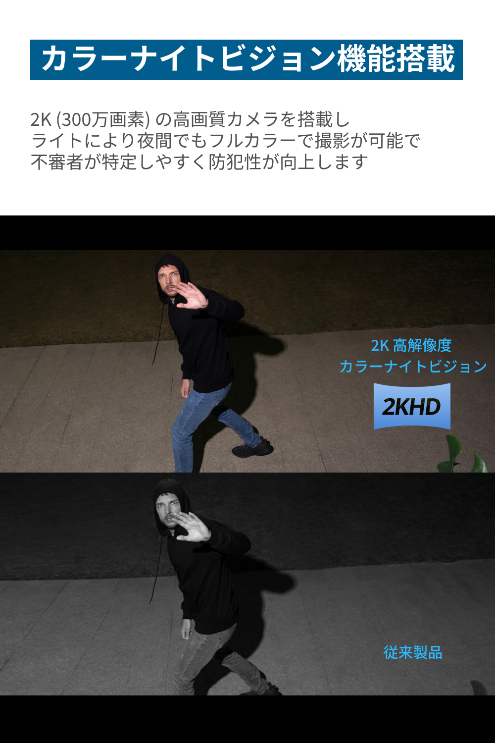 2K (300万画素) の高画質カメラを搭載しライトにより夜間でもフルカラーで撮影が可能で不審者が特定しやすく防犯性が向上します。