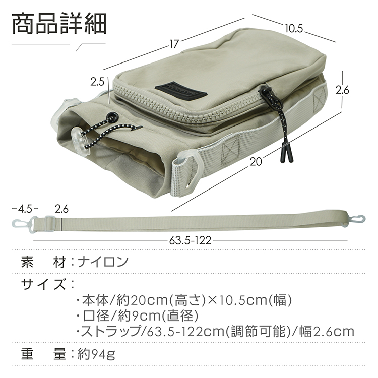 ・サイズ:本体/約20cm(高さ)×10.5cm(幅)、口径/約9cm(直径)、ストラップ/63.5-122cm(調節可能)/幅2.6cm