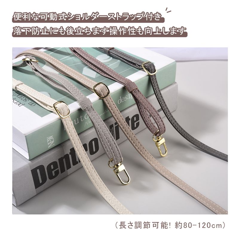 【ショルダーストラップ付き】本体カラーと同色のショルダーがついており、4段階に長さを調整できる 、長さを調整できてショルダーケースになれ、持ち歩くようになります。ベルトの取り付けやすく、お気に入りストラップを変更も可能です。