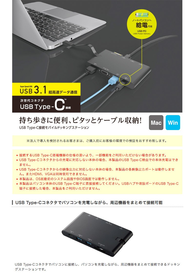 USB Type-Cコネクタでパソコンに接続し、パソコンを充電しながら、周辺機器をまとめて接続できるドッキングステーションです。