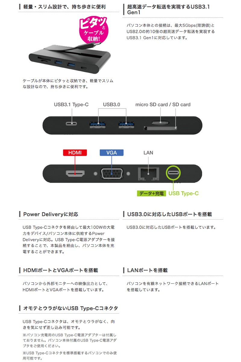 コネクタ仕様(アップストリーム) : USB3.1 Type-C<Gen1(5Gbps)>、PowerDelivery対応(PD3.0、最大100W)、DisplayPort Alt mode