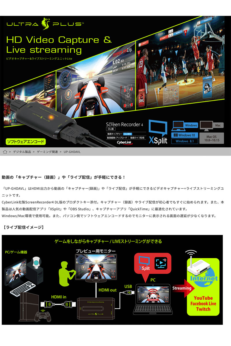 「UP-GHDAVL」はHDMI出力から動画の「キャプチャー(録画)」や「ライブ配信」が手軽にできるビデオキャプチャー+ライブストリーミングユニットです。