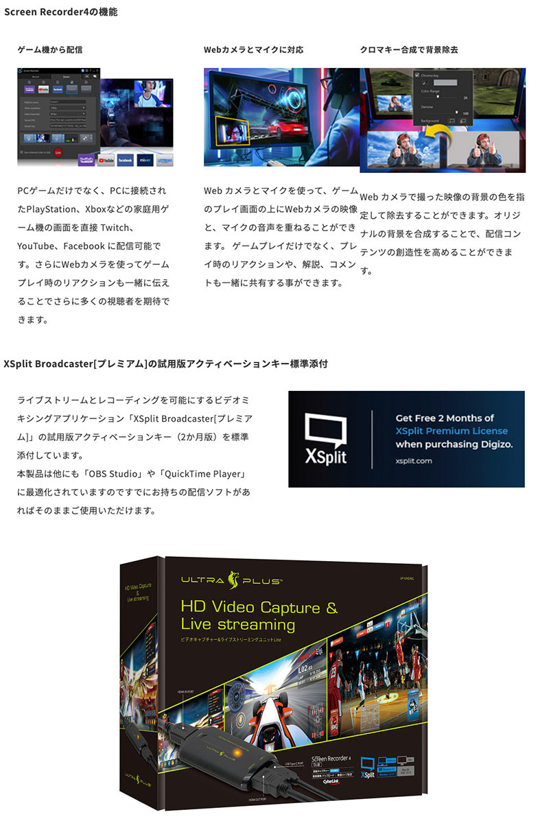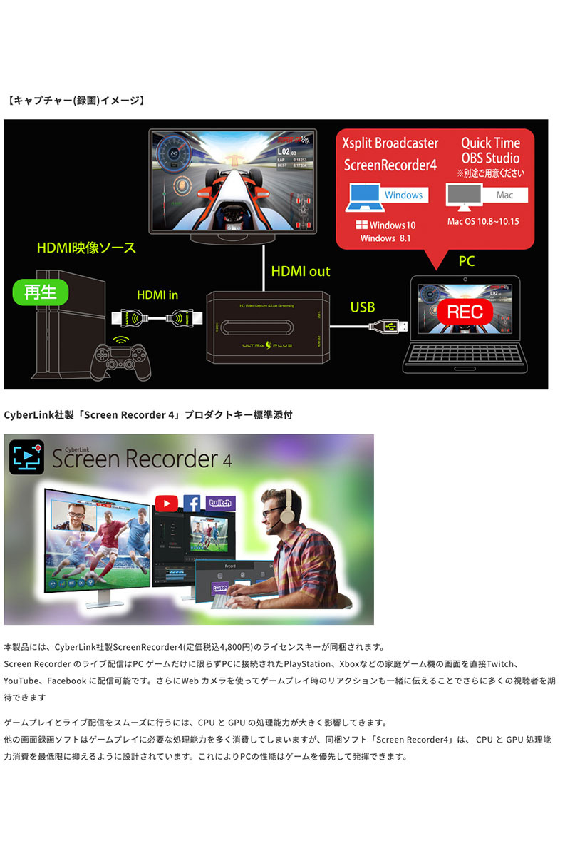 CyberLink社製ScreenRecorder4 DL版のプロダクトキー添付。キャプチャー(録画)やライブ配信が初心者でもすぐに始められます。また、本製品は人気の動画配信アプリ「XSplit」や「OBS Studio」、キャプチャーアプリ「QuickTime」に最適化されています。