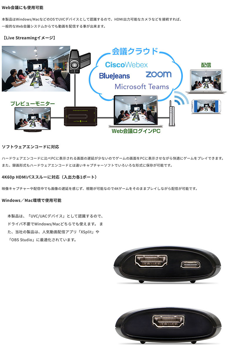 本製品は、「UVC/UACデバイス」として認識するので、ドライバ不要でWindows/Macどちらでも使えます。 また、メーカーの製品は、人気動画配信アプリ「XSplit」や「OBS Studio」に最適化されています。