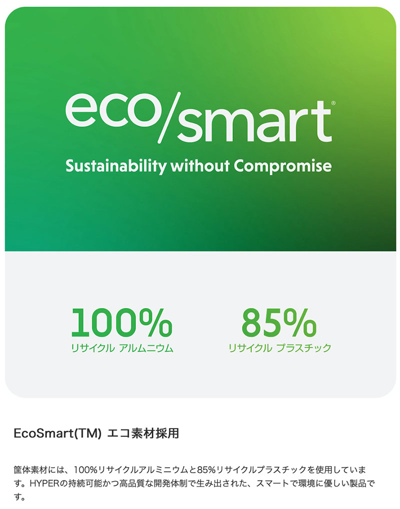 筐体素材には、100%リサイクルアルミニウムと85%リサイクルプラスチックを使用しています。HYPERの持続可能かつ高品質な開発体制で生み出された、スマートで環境に優しい製品です。