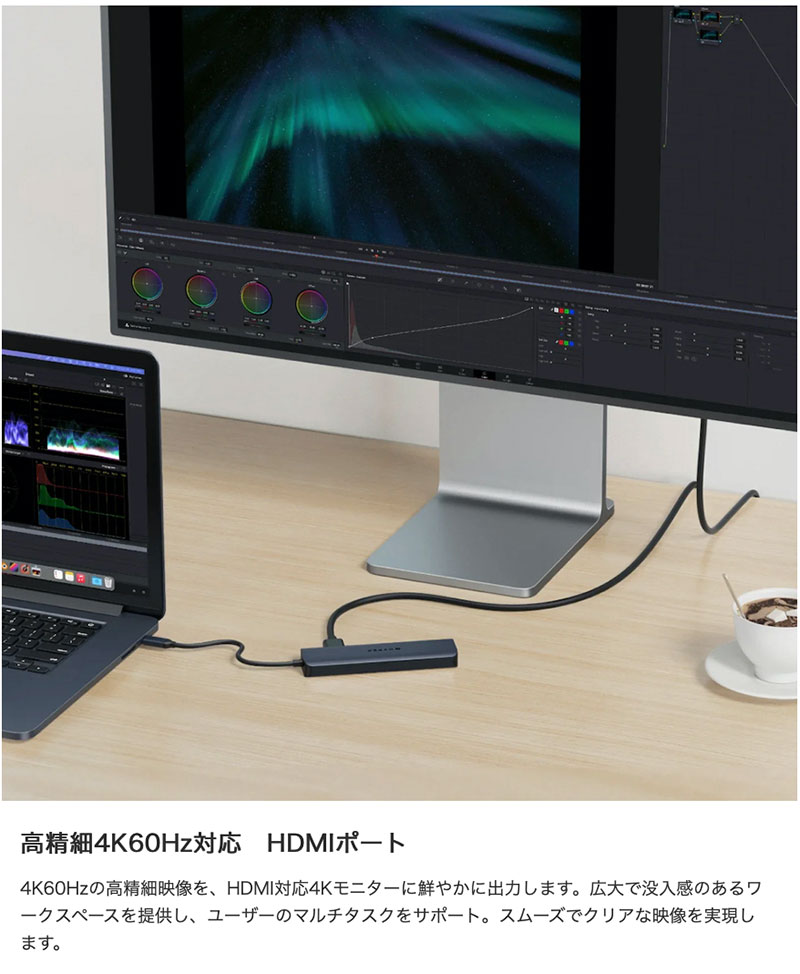 4K60Hzの高精細映像を、HDMI対応4Kモニターに鮮やかに出力します。広大で没入感のあるワークスペースを提供し、ユーザーのマルチタスクをサポート。スムーズでクリアな映像を実現します。