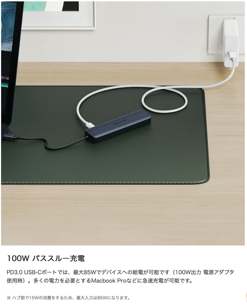 PD3.0 USB-Cポートでは、最大85Wでデバイスへの給電が可能です(100W出力 電源アダプタ使用時)。多くの電力を必要とするMacbook Proなどに急速充電が可能です。