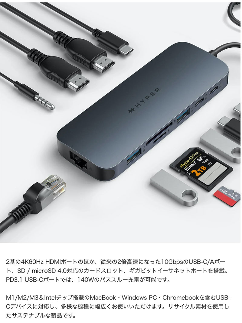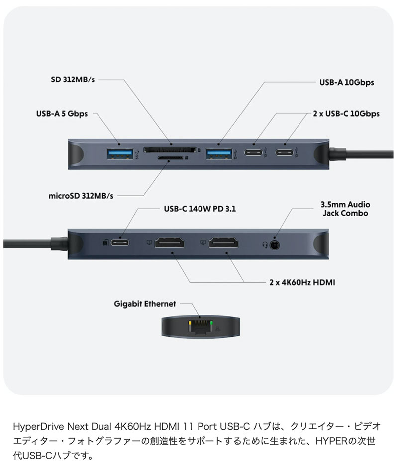HyperDrive Next Dual 4K60Hz HDMI 11 Port USB-C ハブは、クリエイター・ビデオエディター・フォトグラファーの創造性をサポートするために生まれた、HYPERの次世代USB-Cハブです。