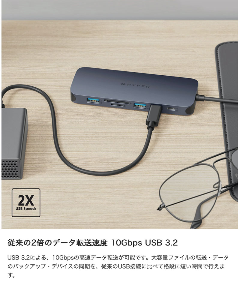 USB 3.2による、10Gbpsの高速データ転送が可能です。大容量ファイルの転送・データのバックアップ・デバイスの同期を、従来のUSB接続に比べて格段に短い時間で行えます。
