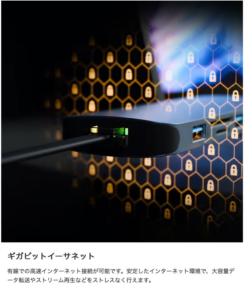 有線での高速インターネット接続が可能です。安定したインターネット環境で、大容量データ転送やストリーム再生などをストレスなく行えます。