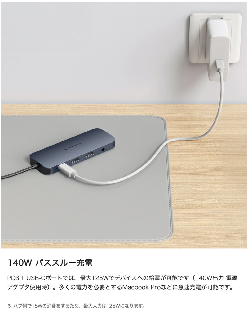 PD3.1 USB-Cポートでは、最大125Wでデバイスへの給電が可能です(140W出力 電源アダプタ使用時)。多くの電力を必要とするMacbook Proなどに急速充電が可能です。