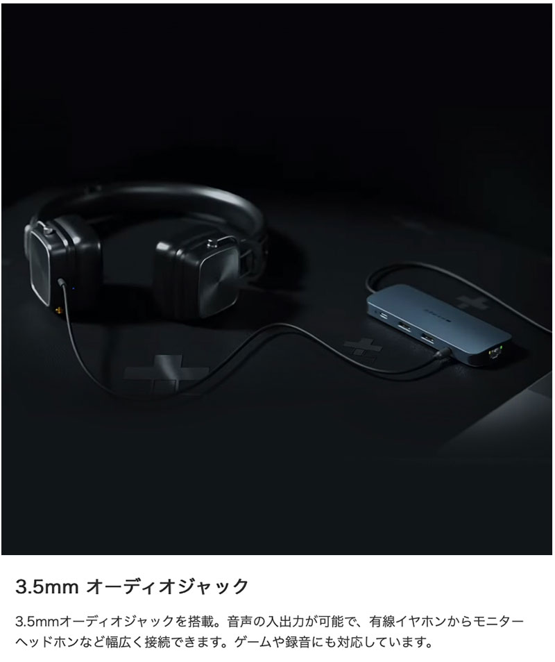 3.5mmオーディオジャックを搭載。音声の入出力が可能で、有線イヤホンからモニターヘッドホンなど幅広く接続できます。ゲームや録音にも対応しています。