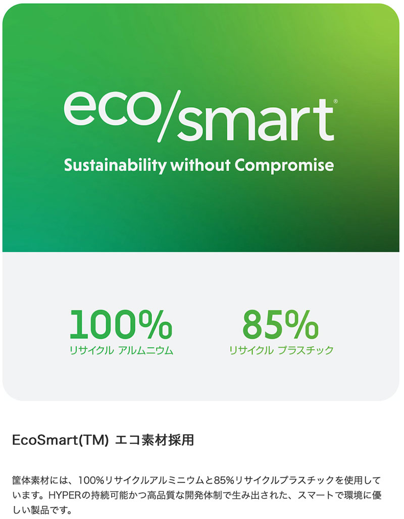 筐体素材には、100%リサイクルアルミニウムと85%リサイクルプラスチックを使用しています。HYPERの持続可能かつ高品質な開発体制で生み出された、スマートで環境に優しい製品です。