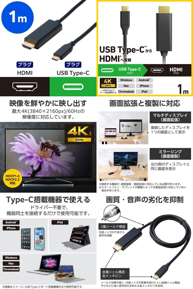 パソコンやスマートフォンなどの映像をディスプレイなどに出力できる、USB Type-C(TM)ポートをHDMI(R)プラグに変換するケーブルです。