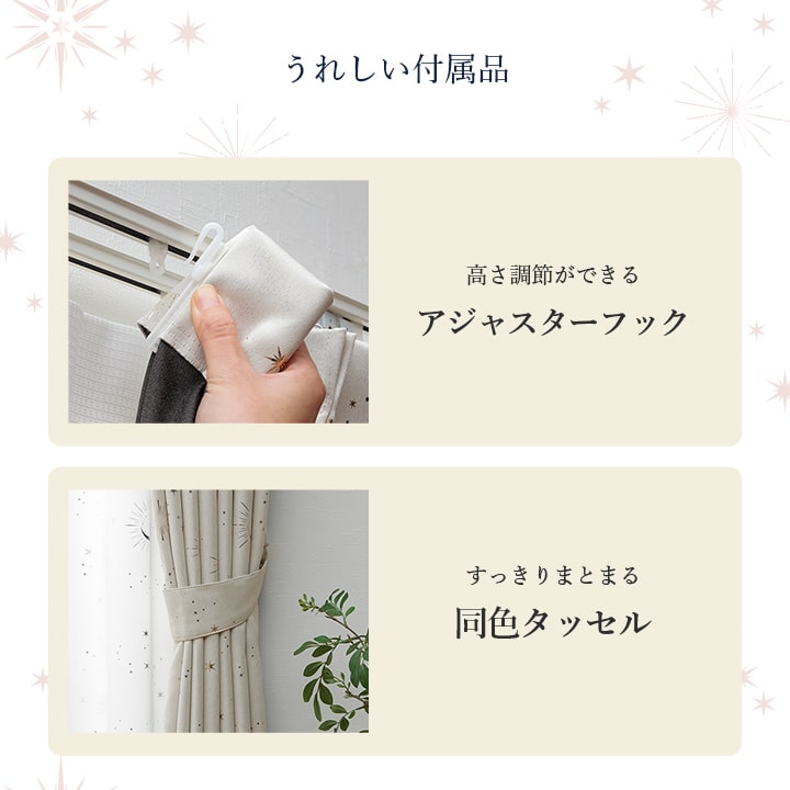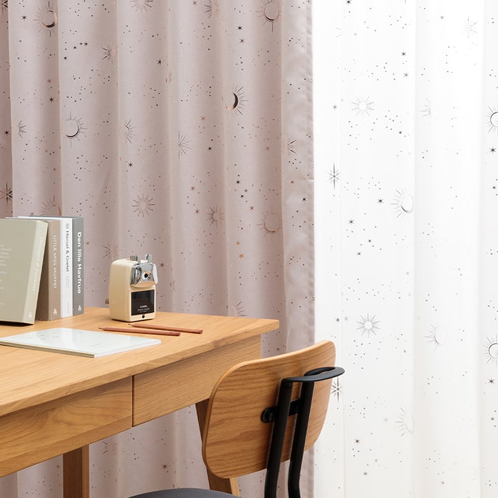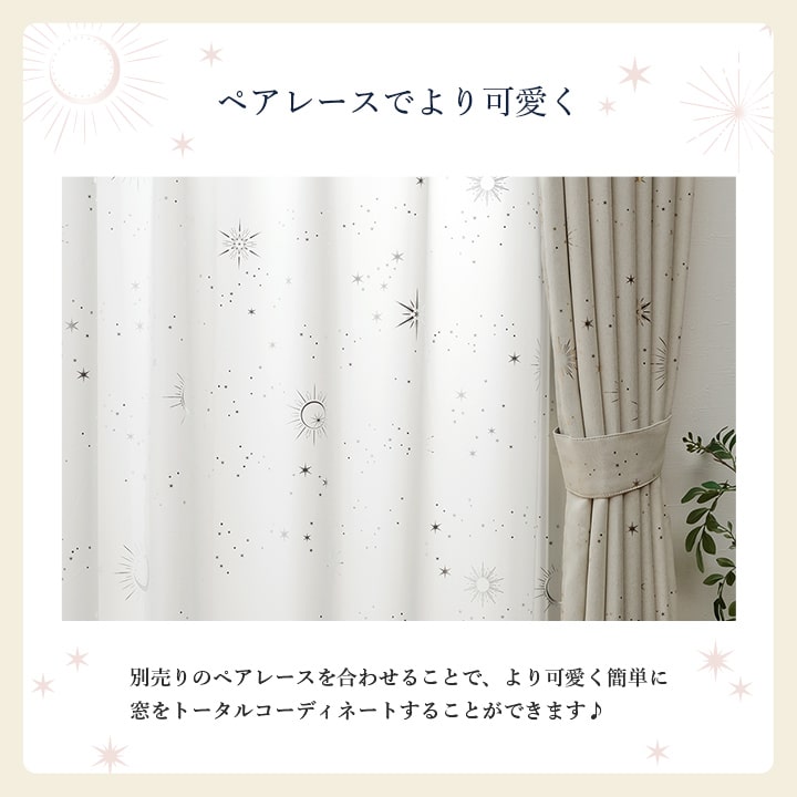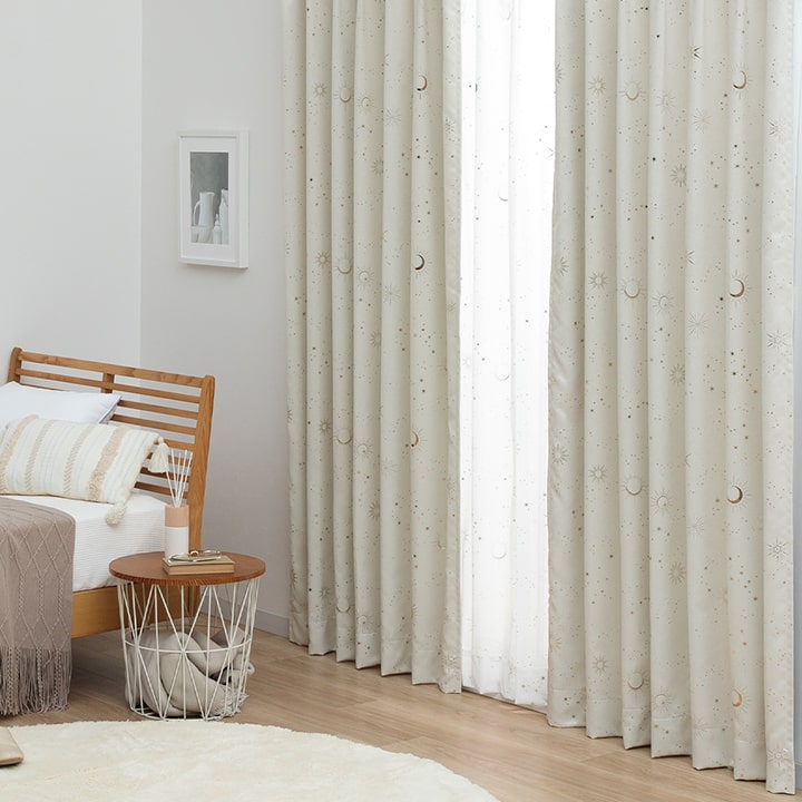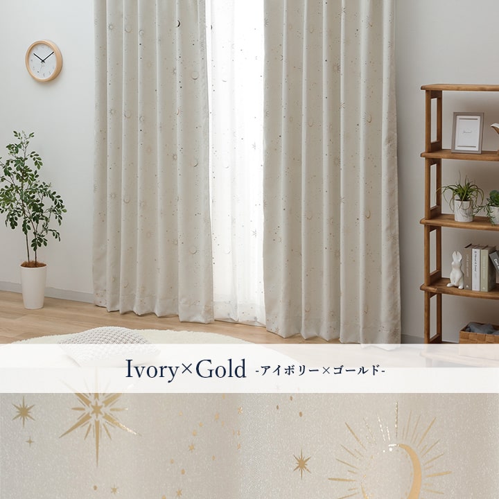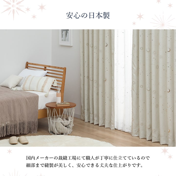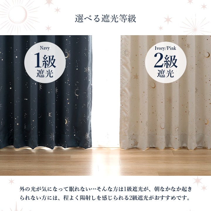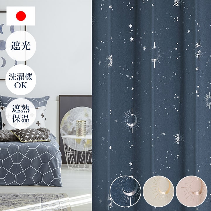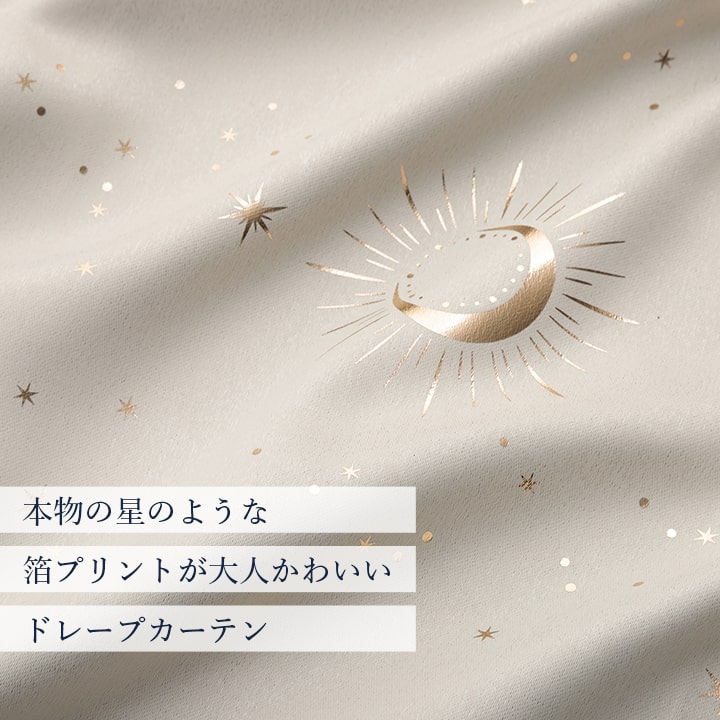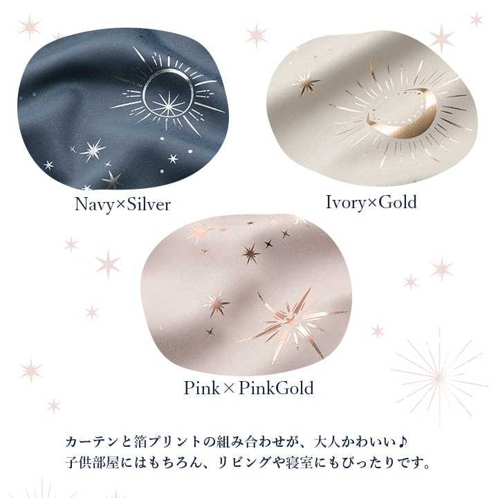 ■ キラキラの箔プリントで星柄をデザインしたドレープカーテン。カーテン×箔プリントの組み合わせは、ネイビー×シルバー、アイボリー×ゴールド、ピンク×ピンクゴールド。子どもっぽくなりすぎない、大人かわいいカーテンなので、子ども部屋はもちろん、リビングや寝室にもピッタリ。