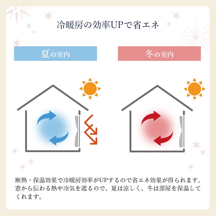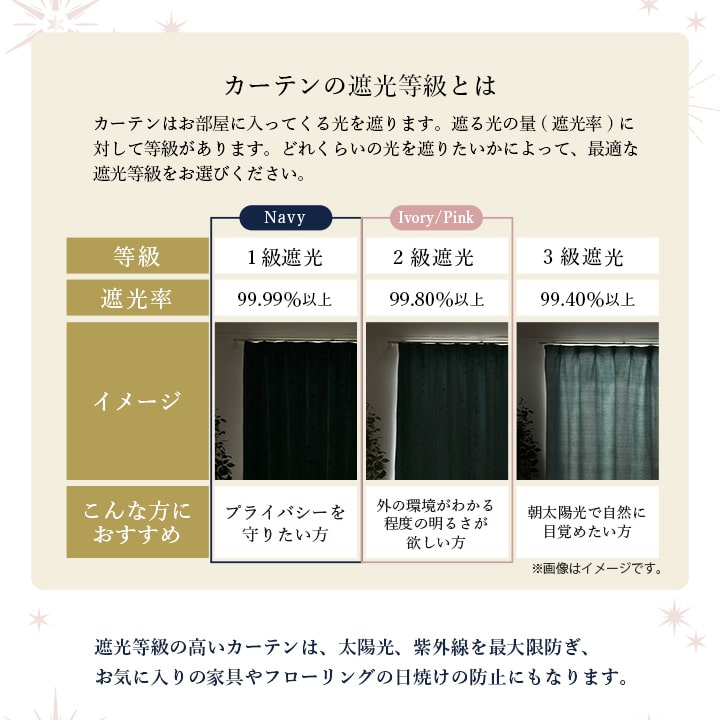 ■ おひさまの光を遮り、良質な睡眠をサポートする遮光カーテン。ネイビーは1級遮光、アイボリー・ピンクは2級遮光です。外の光が気になって眠れない方は1級遮光、朝の光を程よく感じたい方は2級遮光がおすすめです。光だけでなく、外からの視線も遮り、プライバシーを守ります。