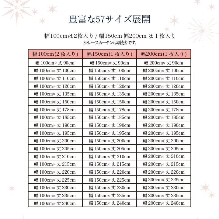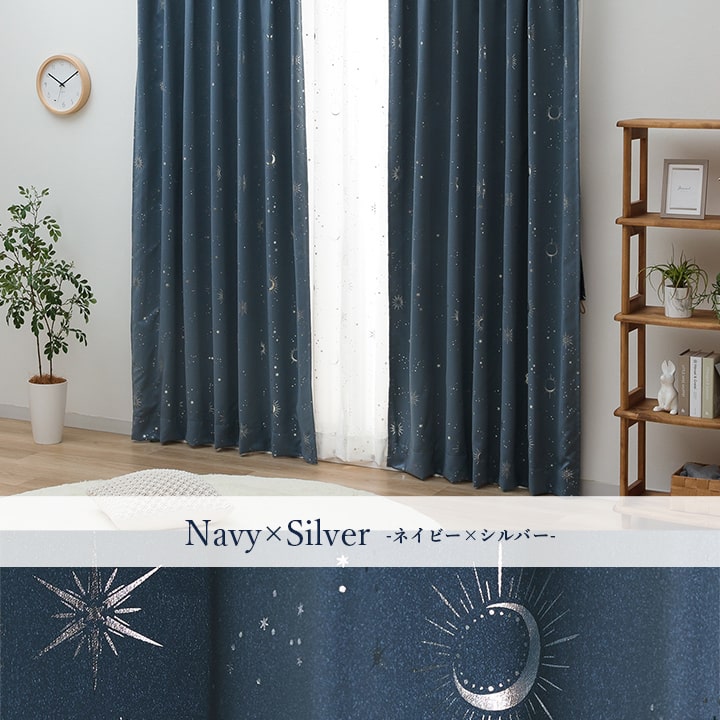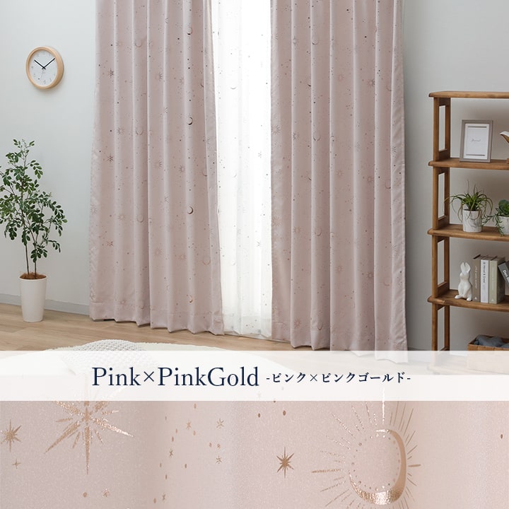 ●キラキラの箔プリントで星柄をデザインしたドレープカーテン。カーテン×箔プリントの組み合わせは、ネイビー×シルバー、アイボリー×ゴールド、ピンク×ピンクゴールド。子どもっぽくなりすぎない、大人かわいいカーテンなので、子ども部屋はもちろん、リビングや寝室にもピッタリ。