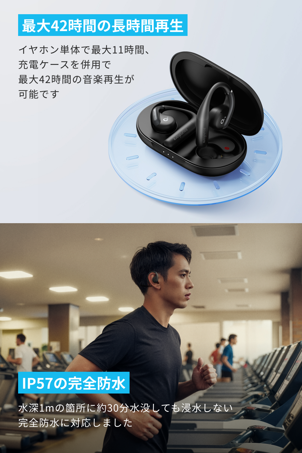 ・耳を塞がないというイヤホン体験の新常識:周囲の音が常に聞こえるため、家事やランニング、会話をしながらでも安心して利用可能です。またイヤホン特有の聞き疲れや蒸れを軽減することで快適な装着感を提供します。